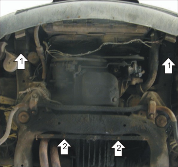 1. Установить на лонжероны Балки правую и левую при помощи Болтов М10х20, Шайб 10 и Гроверов 10. 2. Установить на поперечную балку передней подвески задние точки крепления Защиты при помощи Болтов М8х30, Гаек М8, Шайб 8, и Гроверов 8. 3. Установить на раннее установленные Балки передние точки крепления Защиты при помощи Болтов М8х20, Шайб 8 и Гроверов 8.