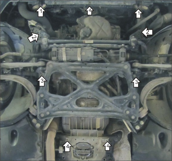 Снять центральную часть пыльника, если она имеется. 1. Установить передние точки переднего щита, при помощи КЛ 51х20 М8, Проставок 25, Болтов М8х50, Шайб 8 и Гроверов 8. 2. Установить средние точки переднего щита в штатные резьбовые отверстия в подрамнике при помощи Болтов М8х60, Проставок 35, Шайб 8 и Гроверов 8. 3. Установить передние точки заднего щита и задние точки переднего щита, заведя задний щит под передний при помощи КЛ 51х20 м8, Болтов М8х30, Шайб 8 и Гроверов 8, предварительно удалив клипсы от крепления пыльника и заменив их КЛ 51х20 М8, Проложить между приварными кронштейнами заднего щита и кузовом а/м по две Шайбы 10. 4. Используя КЛ 51х20 М8, Болты М8х30, Шайбы 8 и Гроверы 8 установить оставшиеся точки крепления щитов к кузову автомобиля.