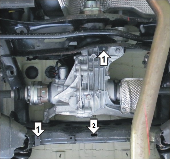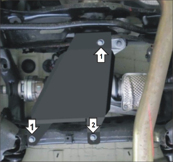 Снять штатный пыльник, при желании пыльник ставится поверх Защиты; 1. В отверстия показанные на изображении установить Закладную КЛ 51х20х6 М8, при помощи Болтов М8х20, Гр.Шайб 8 и Шайб 8 закрепить Щит; 2. В отверстие показанное на изображении установить Закладную ПР 50х20х6 М8, при помощи Болтов М8х20, Гр.Шайб 8 и Шайб 8 закрепить Щит; Затянуть весь крепеж.