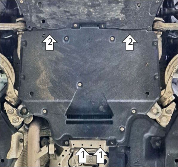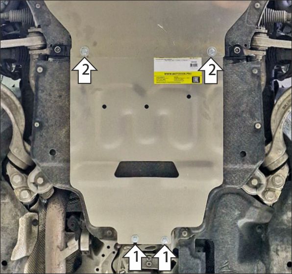 Устанавливается только совместно с защитой двигателя Motodor 340102!!! 1. В штатные отверстия в поперечине под КПП установить задние крепежные точки при помощи закладных планок ПР 30х14х6 М8, болтов М8х30 с шайбами и гр. шайбами 8. 2. Передние точки защиты прикрепить к задней балке защиты 340102. Затянуть весь крепеж с требуемым усилием.