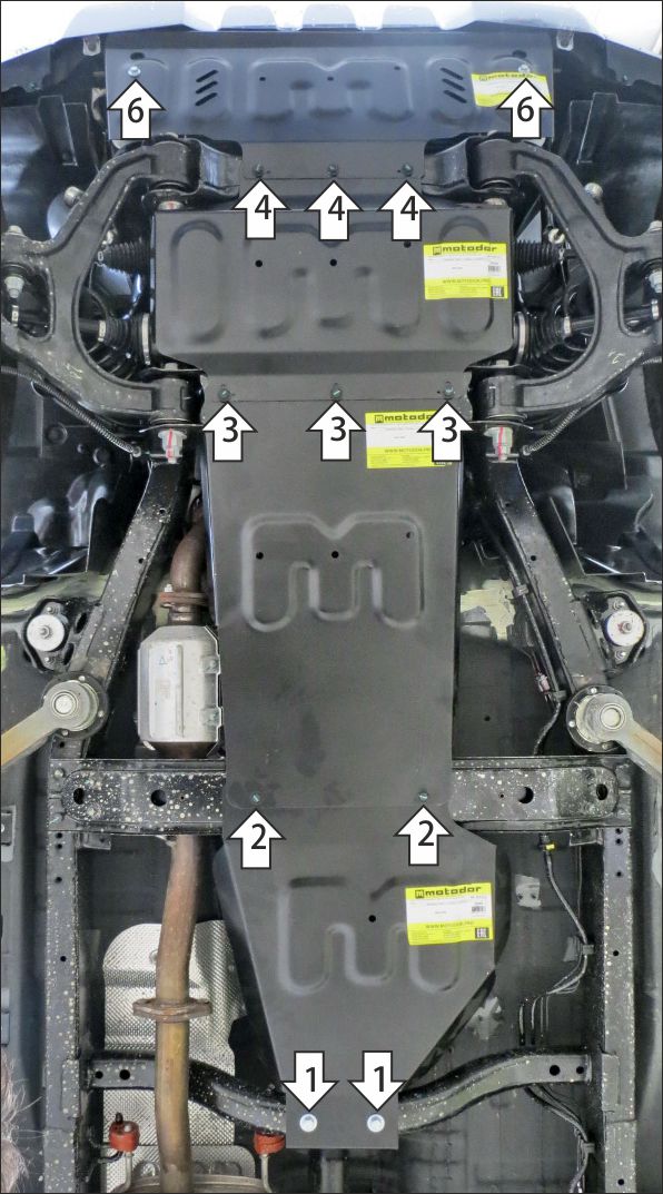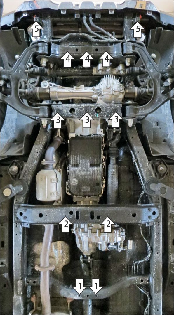 Снять штатные пластиковые пыльники под радиатором и двигателем. Штатный крепеж сохранить! 1. В штатные отверстия в поперечине рамы автомобиля установить задние точки крепления щита 4 при помощи закладных планок ПЗ61х20х6 М10 (устанавливаются поверх поперечины и болтов М10х80 с шайбами и гр. шайбами 10. 2. В штатные резьбовые отверстия в поперечине рамы автомобиля установить передние точки крепления щита 4 и задние точки крепления щита 3 при помощи штатных болтов. 3. В штатные резьбовые отверстия в поперечине рамы автомобиля установить передние точки крепления щита 3 и задние точки крепления щита 2 при помощи штатных болтов. 4. В штатные резьбовые отверстия в поперечине рамы автомобиля установить передние точки крепления щита 2 и задние точки крепления щита 1 при помощи штатных болтов. 5. В штатные резьбовые отверстия на раме автомобиля прикрепить кронштейны при помощи штатных болтов. 6.Прикрепить щит к кронштейнам при помощи болтов М8х30 с шайбами и гр. шайбами 8. Затянуть весь крепеж с требуемым усилием.