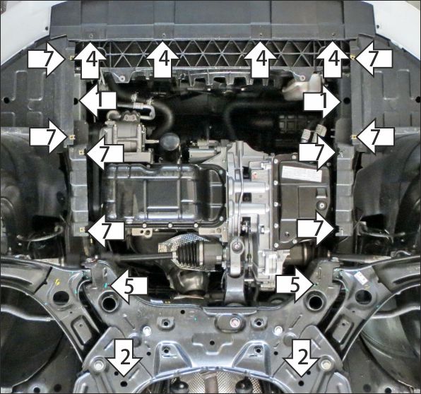 Защита устанавливается вместо штатного пыльника. 1. Снять штатный пластиковый пыльник. В штатные отверстия в лонжеронах автомобиля установить кронштейны при помощи закладных планок ПУ60х16х6 М8 и болтов М8х30 с шайбами и гр. шайбами 8. 2. В штатные отверстия в подрамнике подвески установить задние точки крепления щита при помощи закладных планок ПУ60х16х6 М8 и болтов М8х30 с шайбами и гр. шайбами 8. 3. Прикрепить щит к кронштейнам при помощи болтов М8х30 с шайбами и гр. шайбами 8. 4. В штатные резьбовые отверстия в поперечине под радиатором установить передние точки крепления щита при помощи болтов М6х30 с шайбами и гр. шайбами 6. 5. В штатные резьбовые отверстия в подрамнике подвески установить средние точки крепления щита при помощи болтов М6х20 с шайбами и гр. шайбами 6 6. Прикрепить боковины к щиту при помощи болтов М6х20 с шайбами и гр. шайбами 6 7. Прикрепить защиту к пластиковым щиткам штатным крепежом. Затянуть весь крепеж с требуемым усилием.