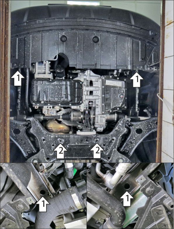 1. Снять штатный пластиковый пыльник. В штатные отверстия в лонжеронах автомобиля установить кронштейны при помощи закладных планок ПУ60х16х6 М8 и болтов М8х30 с шайбами и гр. шайбами 8. Вернуть на место пыльник, проделав в нём отверстия под кронштейны. 2. В штатные резьбовые отверстия в подрамнике подвески установить задние точки крепления щита при помощи болтов М12х30х1,25 с шайбами и гр. шайбами 12. 3. Прикрепить щит к кронштейнам при помощи болтов М8х30 с шайбами и гр. шайбами 8. Затянуть весь крепеж с требуемым усилием.