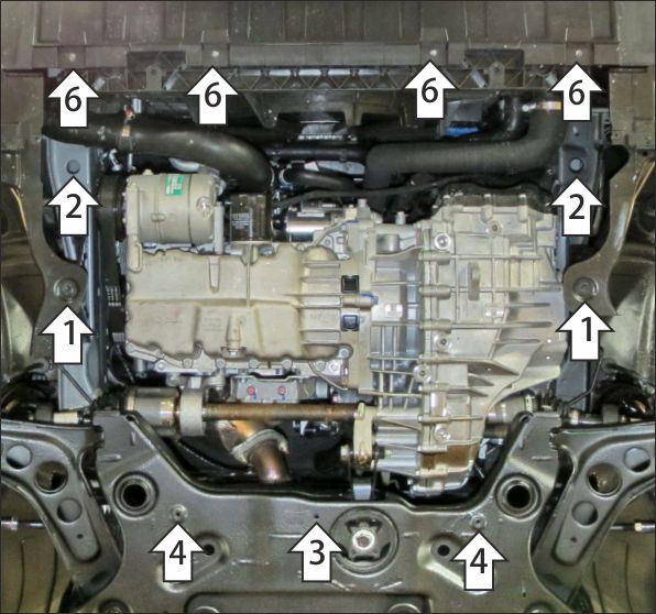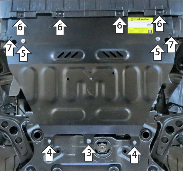 1. Снять штатный пластиковый пыльник. Вернуть на место крепление боковых пыльников к штатным пластиковым кронштейнам. 2. В штатные отверстия в лонжеронах автомобиля установить кронштейны при помощи закладных планок ПР80х20х6 М10 и болтов М10х30 с шайбами и гр. шайбами 10. 3. В штатное отверстия в подрамнике подвески установить заднюю среднюю точку крепления щита при помощи закладной планки ПР50х20х6 М8 и болта М8х30 с шайбой и гр. шайбой 8 . 4. В штатные резьбовые отверстия в подрамнике подвески установить задние боковые точки крепления щита при помощи болтов М6х20 с шайбами и гр. шайбами 6. 5. Прикрепить щит к кронштейнам при помощи болтов М8х30 с шайбами и гр. шайбами 8. 6. В штатные резьбовые отверстия прикрепить щит к рамке радиатора штатным крепежом или при помощи болтов М6х20 с шайбами и гр. шайбами 6 из комплекта крепежа. 7. Прикрепить боковые пыльники к щиту при помощи штатного крепежа. Затянуть весь крепеж с требуемым усилием.