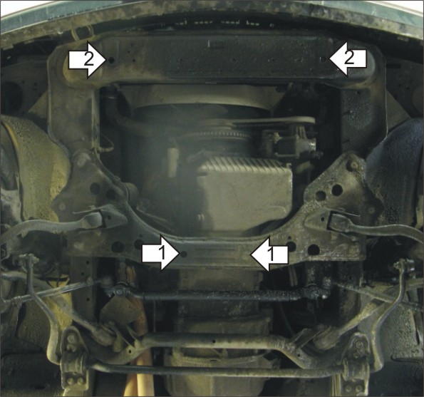 1. Установить на поперечную балку передней подвески задние точки крепления Защиты при помощи ПУ 60х14х6 А20В10 М8, Болтов М8х20, Шайб 8 и Гроверов 8. 2. Установить на поперечную балку подрамника под радиатором передние точки крепления Защиты при помощи ПУ 60х20х6 А20В10 М8, Болтов М8х20, Шайб 8 и Гроверов 8.