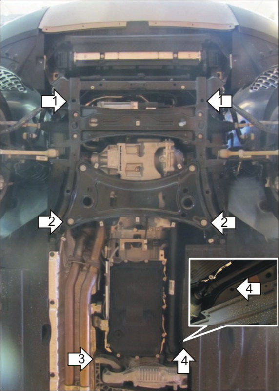 1. Демонтировать штатные пластиковые пыльники. Установить в штатное отверстия в подрамнике Балку 1 при помощи ПР 70х20х6 М10, Болтов М10х30, Шайб 10 и Гроверов 10. 2. Установить на Штатные болты в подрамнике Балку 2. 3. Установить под Штатный болт крепления поперечины Кронштейн правый. 4. Установить на штатное отверстие Кронштейн левый при помощи ПУ 60х14х6 М8, Болта М8х30, Шайбы 8 и Гровера 8. 5. Установить на штатные отверстия в подрамнике задние точки крепления первого Щита Защиты при помощи специальных задних закладных, Проставок 15, Болтов М10х50, Шайб 10 и Гроверов 10. 6. Установить на раннее установленную Балку 1 передние точки крепления первого Щита Защиты при помощи Болтов М10х20, Шайб 10 и Гроверов 10. 7. Установить на раннее установленную Балку 2 передние точки крепления второго Щита Защиты при помощи Болтов М10х20, Шайб 10 и Гроверов 10. 8. Установить на раннее установленный Кронштейн правый правую заднюю точку крепления второго Щита при помощи Болта М8х20, Шайбы 8 и Гровера 8. 9. Установить на раннее установленный Кронштейн левый левую заднюю точку крепления второго Щита при помощи Болта М8х20, Шайбы 8 и Гровера 8. 10. Закрепить штатный пластиковый кожух ко второму Щиту при помощи Клипс, Болтов М8х30, Шайб 8 и Гроверов 8.
