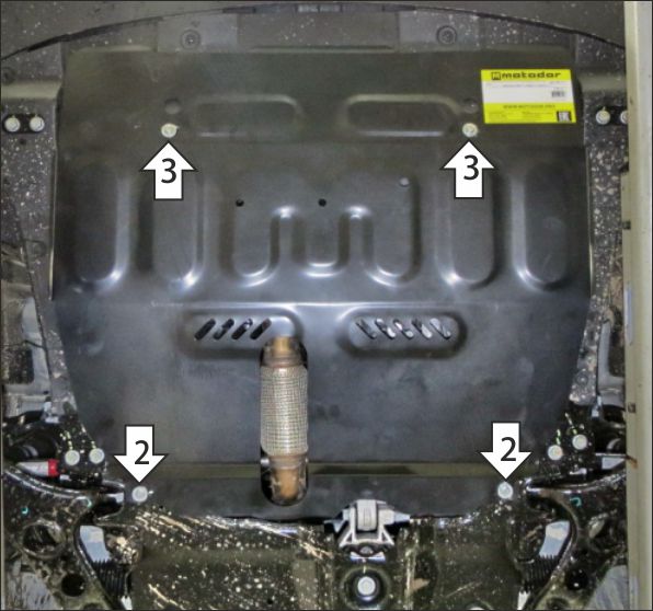 1. Снять штатный пластиковый пыльник. В штатные отверстия в лонжеронах автомобиля установить кронштейны при помощи закладных планок ПР70х20х6 М10 и болтов М10х20 с шайбами и гр. шайбами 10. Вернуть на место пыльник, сделав в нём отверстия для кронштейнов. 2. В штатные отверстия в подрамнике подвески установить задние точки крепления щита при помощи закладных планок ПР70х20х6 М10 и болтов М10х30 с шайбами и гр. шайбами 10. На автомобилях после рестайлинга 2024 года использовать болты М10х50 с проставками 25. 3. Прикрепить щит к кронштейнам при помощи болтов М10х30 с шайбами и гр. шайбами 10. Затянуть весь крепеж с требуемым усилием.