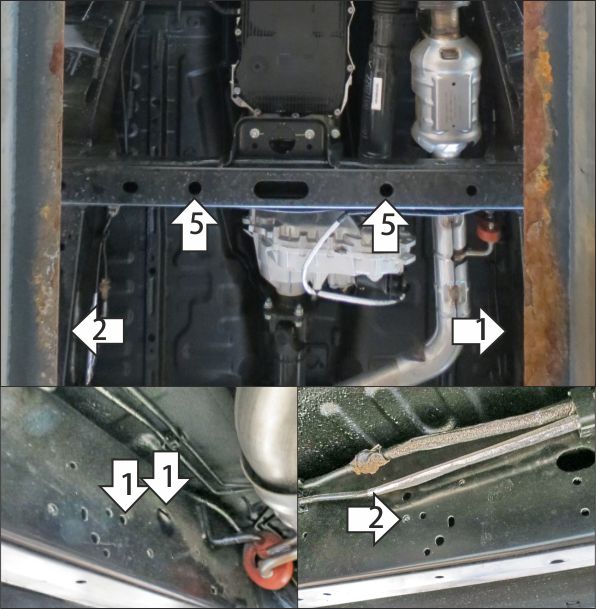 1. В штатные отверстия в поперечине рамы установить задние точки крепления защиты при помощи закладных планок ПР80х20х6 М10 и болтов М10х30 с шайбам и гр. шайбами 10. 2. В штатные отверстия в поперечине рамы установить передние точки крепления защиты при помощи закладных планок ПР70х20х6 М10 и болтов М10х30 с шайбам и гр. шайбами 10. Затянуть весь крепеж с требуемым усилием.