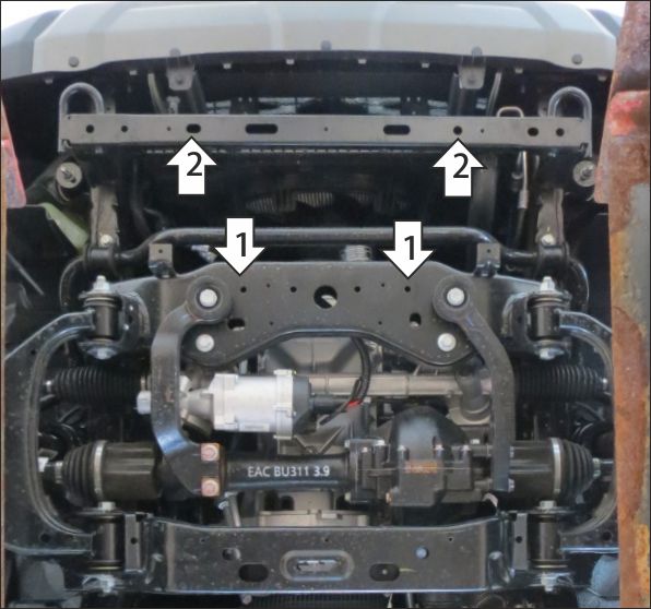 Защита устанавливается только совместно с защитой двигателя Motodor! Снять штатную защиту радиатора. 1. Прикрепить задние точки крепления защиты к передним точкам крепления защиты двигателя при помощи болтов М10х30 с шайбам и гр. шайбами 10 (можно использовать болты от уже установленной защиты двигателя). 2. В штатные отверстия в поперечине рамы установить передние точки крепления защиты при помощи закладных планок ПР70х20х6 М10 и болтов М10х30 с шайбам и гр. шайбами 10. Затянуть весь крепеж с требуемым усилием.