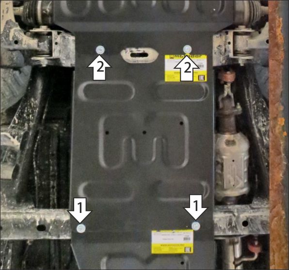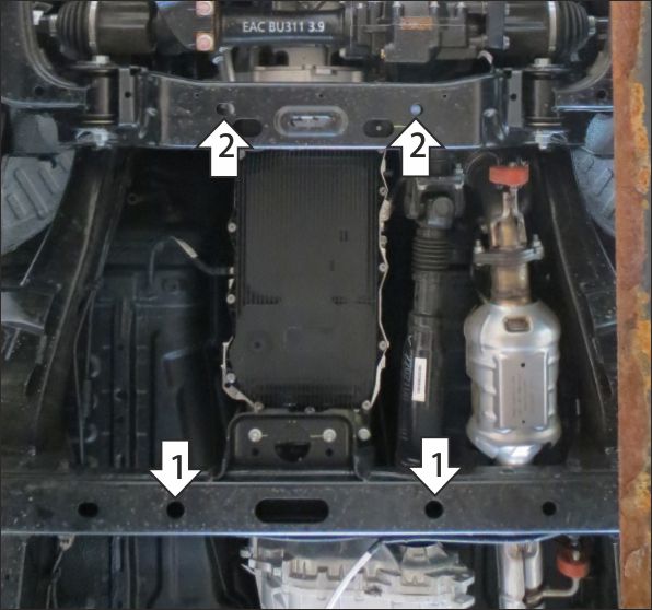 1. В штатные отверстия в поперечине рамы установить задние точки крепления защиты при помощи закладных планок ПР80х20х6 М10 и болтов М10х30 с шайбам и гр. шайбами 10. 2. В штатные отверстия в поперечине рамы установить передние точки крепления защиты при помощи закладных планок ПР70х20х6 М10 и болтов М10х30 с шайбам и гр. шайбами 10. Затянуть весь крепеж с требуемым усилием.