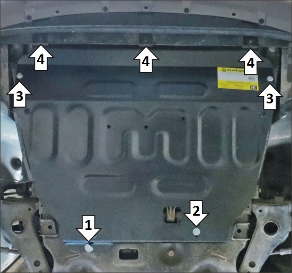 Снять штатный пластиковый пыльник при его наличии. 1. Установить заднюю правую точку крепления защиты в штатное отверстие в подрамнике при помощи планки ПР80х20х6 М10, болта М10х30, шайбы и гр. шайбы 10. 2. Установить заднюю левую точку крепления защиты в штатное отверстие в подрамнике при помощи планки ПР30х14х6 М8, проставки 15, болта М8х40, шайбы и гр. шайбы 8. 3. Установить средние точки крепления защиты в штатные резьбовые отверстия в подрамнике при помощи болтов М8х30, шайб 8 и гр. шайб 8. 4. Установить передние точки крепления защиты в штатные резьбовые отверстия в поперечине кузова при помощи болтов М6х20, шайб 6 и гр. шайб 6. Затянуть весь крепеж.