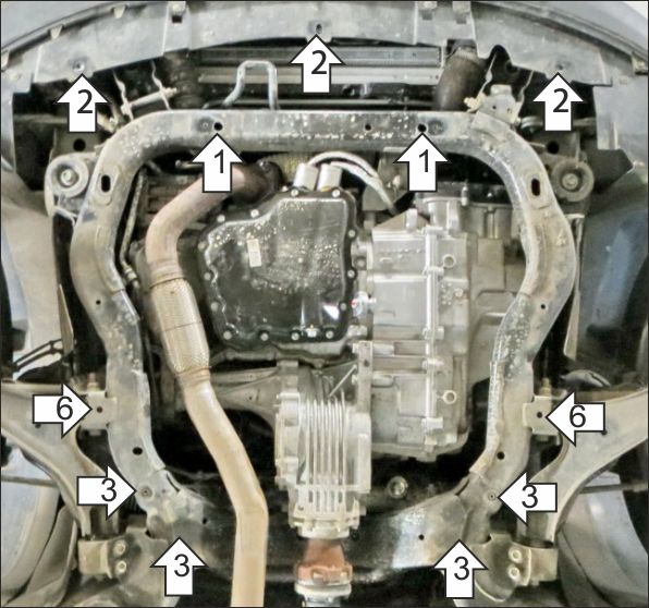 Снять штатный пластиковый пыльник при его наличии. 1. Установить в штатные отверстия поперечной балки подрамника балку .02 при помощи планок ПУ 60х14х6 М8 (или ПР30х14х8 М8 справа) и болтов М8х30 с шайбами и гр. шайбами 8. 2. Выкрутить 3 штатных болта крепления бампера. 3. Ослабить 4 штатных болта крепления поперечной балки и установить под них задние точки крепления защиты (при отсутствии поперечной балки установить балку .03 в штатные резьбовые отверстия при помощи болтов М6х30 с шайбами и гр. шайбами 6 и прикрепить к ней защиту при помощи болтов М8х20 с шайбами и гр. шайбами 8). 4. Установить на ранее установленную балку .02 передние точки крепления защиты при помощи болтов М8х20 с шайбами и гр. шайбами 8. 5. Установить под ранее выкрученные болты крепления бампера передние точки крепления защиты. 6. Установить в отверстия подрамника напротив рычагов подвески средние точки крепления защиты при помощи планок ПР 50х20х6 М8, проставок 20 (устанавливаются между подрамником и защитой) и болтов М8х40 с шайбами и гр. шайбами 8. Затянуть весь крепеж с требуемым усилием.