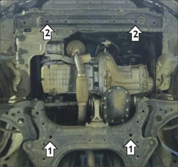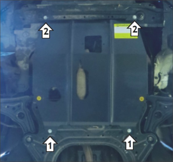 1. В штатные отверстия подрамника подвески установить задние точки крепления Защиты при помощи Планок ПУ60х14х6 М8, Болтов М8х30 с Гр. Шайбами 8 и Шайбами 8. 2. В штатные отверстия поперечины радиатора установить передние точки крепления Защиты при помощи Планок ПР30х14х6 М8, Болтов М8х20 с Гр. Шайбами 8 и Шайбами 8. 3. Прикрепить Лючок при помощи Болтов М8х16 с Шайбами 8. Затянуть весь крепеж.