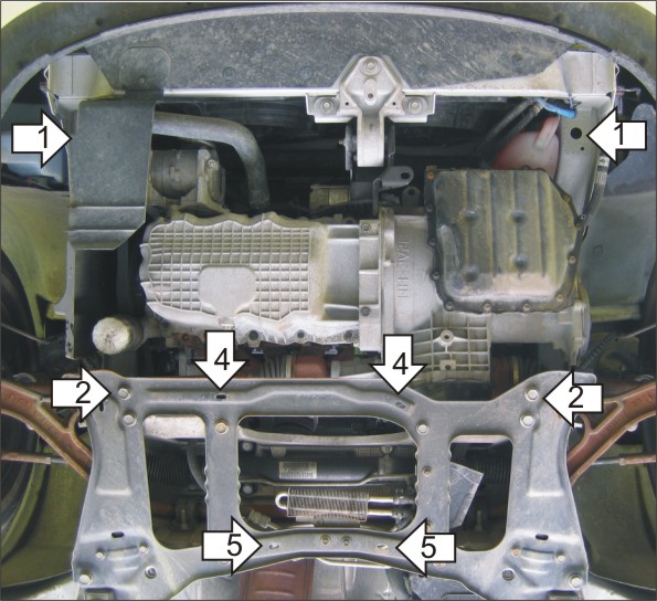 1. Установить на лонжероны Кронштейны при помощи ПР 80х20х6 М10, Болтов М10х30, Гроверов 10 и Шайб 10. 2. Установить на поперечную балку передней подвески задние точки крепления первого Щита при помощи Штатных болтов. 3. Установить на раннее установленные Кронштейны передние точки крепления первого Щита при помощи Болтов М10х20, Гроверов 10 и Шайб 10. 4. Установить на подрамник передние точки крепления второго Щита при помощи ПР 50х20х5 М8, Болтов М8х30, Гроверов 8 и Шайб 8. 5. Установить на подрамник задние точки крепления второго Щита при помощи ПР 50х20х5 М8, Болтов М8х30, Гроверов 8 и Шайб 8.