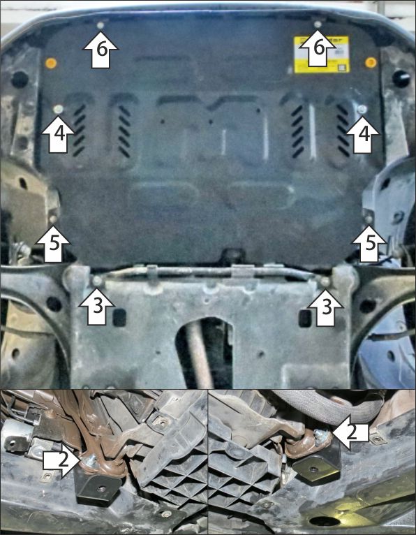 1. Снять передний (больше не понадобится) и задний штатные пластиковые пыльники. 2. Установить в штатные отверстия в рамке радиатора передние кронштейны при помощи болтов М8х30 с шайбами 8 и самоконтрящимися гайками М8 DIN 985, при необходимости подрезав локера. 3. Установить задние точки крепления защиты под распорку кузова на штатный крепеж. 4. Прикрепить щит к кронштейнам при помощи болтов М8х30 с шайбами и гр. шайбами 8. 5. Прикрепить защиту к локерам, используя штатный крепеж. 6. Прикрепить защиту к переднему бамперу при помощи болтов М6х30 с шайбами и гр. шайбами 6. Затянуть весь крепеж с необходимым усилием. Вернуть на место задний штатный пластиковый пыльник.