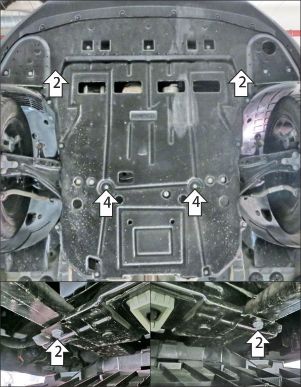 1. Снять штатные тканевый и пластиковый (расположен непосредственно под передним бампером) пыльники с автомобиля. 2. Выкрутить штатные болты из рамки радиатора, в освободившиеся резьбовые отверстия установить балку при помощи болтов М8х30 с шайбами и гр. шайбами 8. 3. Вернуть под передний бампер пластиковый пыльник, предварительно сделав в его вертикальных подгибах соответствующие вырезы под балку защиты картера. Установить на место штатный тканевый пыльник, предварительно обрезав его переднюю часть так, чтобы он лежал сверху на балке защиты картера и заканчивался перед началом её переднего подгиба. 4. Установить задние точки крепления защиты в штатные резьбовые отверстия крепления пыльника при помощи проставок 15, болтов М6х40 с шайбами и гр. шайбами 6. 5. Прикрепить щит к балке при помощи болтов М8х20 с шайбами и гр. шайбами 8. Затянуть весь крепеж с необходимым усилием.