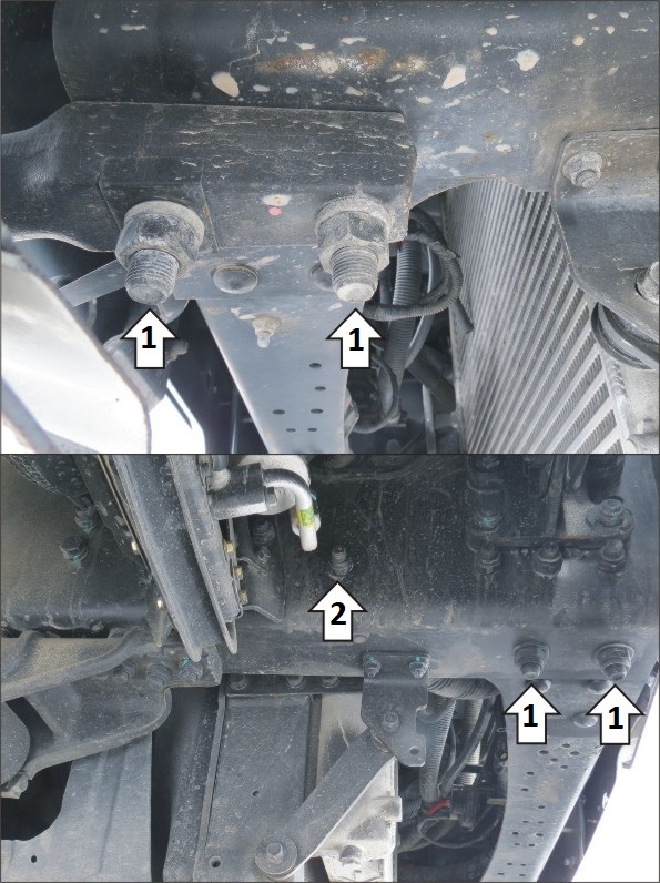 1. Установить передние кронштейны под штатные болты крепленя поперечины рамы (слева кронштейн установить между буксировочным крюком и рамой). 2. Установить задние кронштейны под штатные гайки. 3. Прикрепить щит к кронштейнам при помощи болтов М12х40 с шайбами и гайками М12. затянуть весь крепеж с требуемым усилием.