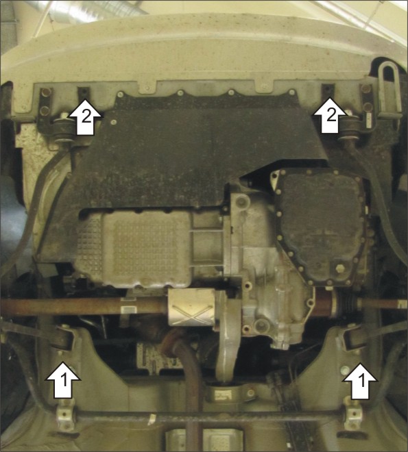 Защита устанавливается на автомобили с АКПП. 1. Снять штатный пыльник, если он установлен на автомобиле. Установить на Болты шарнира нижнего рычага задние точки защиты при помощи Штатных гаек М12. 2. Выкрутить передние Болты Кронштейна растяжки, установить вместо них передние точки защиты через Проставки 15 и Болты М10х1,25х55 (для Lada Калина до 2011 г.в. использовать Болты М10х1,25х80).