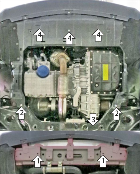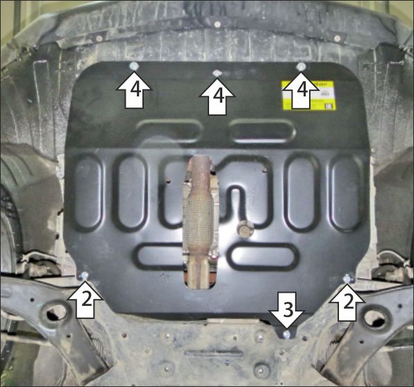 1. В штатные отверстия в рамке радиатора установить закладные планки КЛ 51х20 М8, при необходимости частично демонтировав штатный пластиковый пыльник. Сделать соответствующие вырезы в пыльнике для того, чтобы далее прикрепить щит к закладным планкам. Вернуть штатный пыльник на место. 2. В штатные резьбовые отверстия в подрамнике автомобиля установить средние точки крепления защиты, заменив штатные болты крепления пыльника на болты М6х50 с шайбами и гр. шайбами 6, и используя проставки 25. 3. В штатное резьбовое отверстие в подрамнике автомобиля установить заднюю точку крепления защиты при помощи болта М6х20 с шайбой и гр. шайбой 6. 4. В штатное резьбовое отверстие крепления пыльника к рамке радиатора прикрепить щит, заменив штатный болт на болт М6х20 с шайбой и гр. шайбой 6. Оставшиеся передние точки крепления защиты прикрепить к ранее установленным закладным планкам при помощи болтов М8х30 с шайбами и гр. шайбами 8. Затянуть весь крепеж с требуемым усилием.