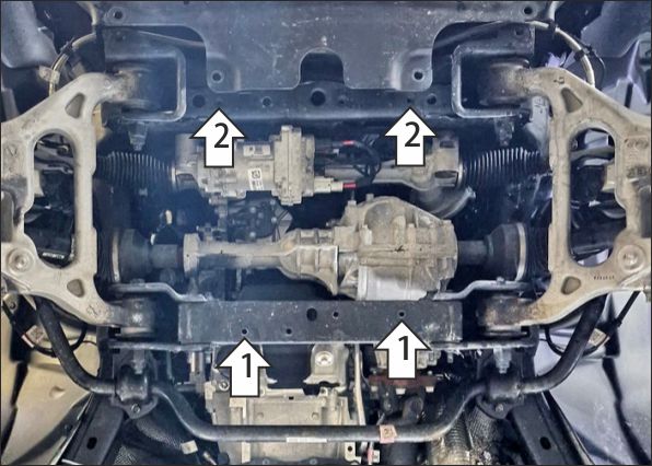 Снять штатную защиту (больше не понадобится). 1. В штатные резьбовые отверстия в поперечине рамы установить задние точки крепления защиты при помощи болтов М10х30 с шайбами и гр. шайбами 10. 2. Под болты крепления штатной защиты радиатора установить передние точки крепления. Затянуть весь крепеж с требуемым усилием.