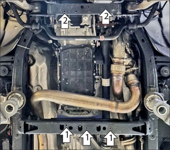 Снять штатную защиту (больше не понадобится). 1. В штатные резьбовые отверстия в поперечине рамы установить задние точки крепления защиты при помощи болтов М10х30 с шайбами и гр. шайбами 10. 2. В штатные резьбовые отверстия в поперечине рамы установить передние точки крепления защиты при помощи болтов М10х30 с шайбами и гр. шайбами 10. Затянуть весь крепеж с требуемым усилием.