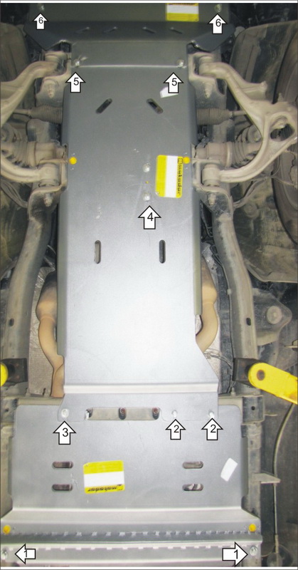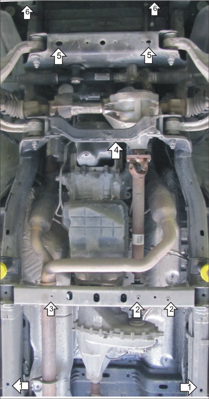 1. Установить на отверстия подрамника задние точки крепления Щита 3 открытыми пазами при помощи Закладных, Болтов М10х30, Шайб 10 и Гроверов 10. 2. Установить передние точки крепления Щита 3 и задние точки Щита 2 на штатные резьбовые втулки при помощи, Болтов М8х35, Шайб 8 и Гроверов 8. 3. Установить переднюю правую точку крепления Щита 3 и правую заднюю Щита 2 при помощи ПЗ 106х20х6 А85 М10, Болта М10х35, Шайбы 10 и Гровера 10. 4. Установить на поперечную балку Скобу и на нее крепить Щит 2 при помощи Болтов М10х30, Шайб 10 и Гроверов 10. 5. Установить в отверстия поперечной балки кузова ПЗ 106х20х6 А85 М10. Закрепить задние точки Щита 1 и передние точки Щита 2 с помощью Болтов М10х50, Шайб и Гр. Шайб 10. 6. Установить передние точки крепления Щита 1 на Штатные резьбовые гайки при помощи Штатных болтов, если на автомобиле нет Штатных болтов, то устанавливаем при помощи Закладных ПЗ х20х6 А50 М10 и Болтов М10х60.