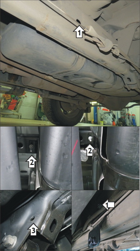 1. В отверстие лонжерона рамы установить Кронштейн .02 при помощи Болта М10х100, Гайки М10 с Шайбами и Гр. Шайбой 10. 2. На штатные точки крепления топливного бака установить Кронштейны .03 и .04. 3. В отверстие в кронштейне рычага подвески установить Кронштейн .05 при помощи Болта М10х100, Гайки М10, Шайб и Гр. Шайбы 10. 4. Прикрепить Щит к Кронштейнам при помощи Болтов М10х30 с Шайбами и Гр. Шайбами 10. Затянуть весь крепеж.