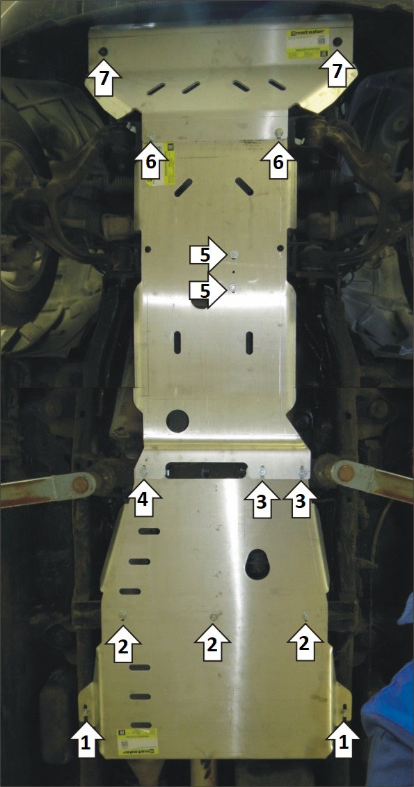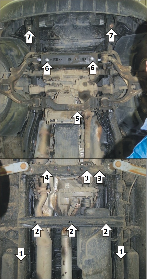 1. Установить в отверстия подрамника задние точки крепления щита 3 открытыми пазами при помощи закладных, болтов М10х30, шайб и гр. шайб 10. 2. Установить щит 3 к поперечине рамы автомобиля помощи планок ПР80х20х6 М10, болтов М10х30, шайб и гр. шайб 10. 3. Установить передние точки крепления щита 3 и задние точки щита 2 на штатные резьбовые втулки при помощи болтов М8х40, шайб и гр. шайб 8. 4. Установить переднюю правую точку крепления щита 3 и правую заднюю щита 2 при помощи планки ПЗ 106х20х6 М10, болта М10х40, шайбы и гр. шайбы 10. 5. Установить на поперечную балку скобу, и на нее закрепить щит 2 при помощи болтов М10х40, шайб и гр. шайб 10. 6. Установить в отверстия поперечной балки рамы планки ПЗ 106х20х6 М10. Закрепить задние точки щита 1 и передние точки щита 2 с помощью болтов М10х50, шайб и гр. шайб 10. 7. Установить передние точки крепления щита 1 на штатные гайки при помощи штатных болтов, либо при помощи планок ПЗ 101х20х6 М10, болтов М10х60, шайб и гр. шайб 10. Затянуть весь крепеж.