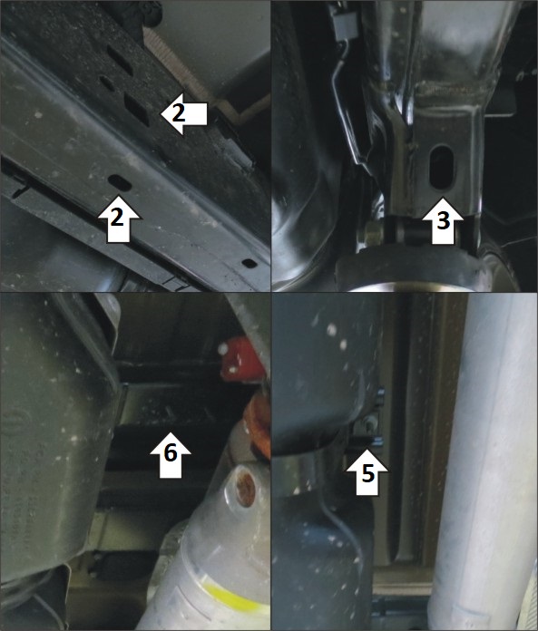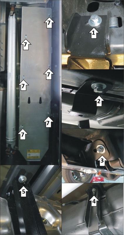1. В штатное отверстие в боковине рамы автомобиля установить Кронштейн.02 при помощи клипсы КЛ 51х20 М8, Болта М8х20 с Шайбой и Гр. Шайбой 8. 2. В штатное отверстие в раме автомобиля установить Кронштейн.03 при помощи планки ПР 70х20хМ10 (устанавливается через боковое отверстия в раме), Болта М10х30 с Шайбой и Гр. Шайбой 10. 3. В штатное отверстие кронштейна рычага подвески заднего моста установить Кронштейн.04 при помощи планки ПР70х20 М10, Болта М10х20 с Шайбой и Гр. Шайбой 10. 4. На штатное крепление передней скобы топливного бака прикрепить Кронштейн.05. 5. На штатную шпильку М8 прикрепить Кронштейн.06 при помощи Гайки М8 с Шайбой и Гр. Шайбой 8. 6. На штатную шпильку М8 прикрепить Кронштейн.07 при помощи Гайки М8 с Шайбой и Гр. Шайбой 8. 7. Прикрепить Щит к Кронштейнам при помощи Болтов М10х30 с Шайбами и Гр. Шайбами 10. Затянуть весь крепеж.