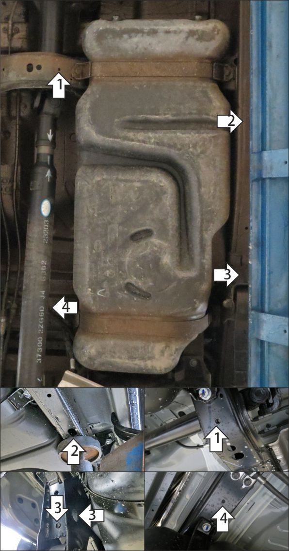 1. В штатное резьбовое отверстие установить кронштейн 1 при помощи болта М8х20 с шайбой и гр. шайбой 8. 2. В штатное отверстие в лонжероне рамы установить кронштейн 2 при помощи закладной планки ПР70х20х6 М10, болта М10х30 с шайбой и гр. шайбой 10. 3. В штатное отверстие в кронштейне рычага подвески установить кронштейн 3 при помощи закладной планки ПР70х20х6 М10, болта М10х30 с шайбой и гр. шайбой 10. Закладную планку удобно устанавливать через отверстие в кронштейне со стороны бака. 4. В штатное отверстие в поперечине рамы установить кронштейн 4 при помощи закладной планки ПР50х20х6 М8 и болта М8х20 с шайбой и гр. шайбой 8. В случае, если это в отверстие закреплен хомут трубки системы AdBlue, хомут переставить в отверстие на кронштейне. 5. Прикрепить щит к кронштейнам при помощи болтов М8х20 с шайбам и гр. шайбами 8. Затянуть весь крепеж с требуемым усилием.