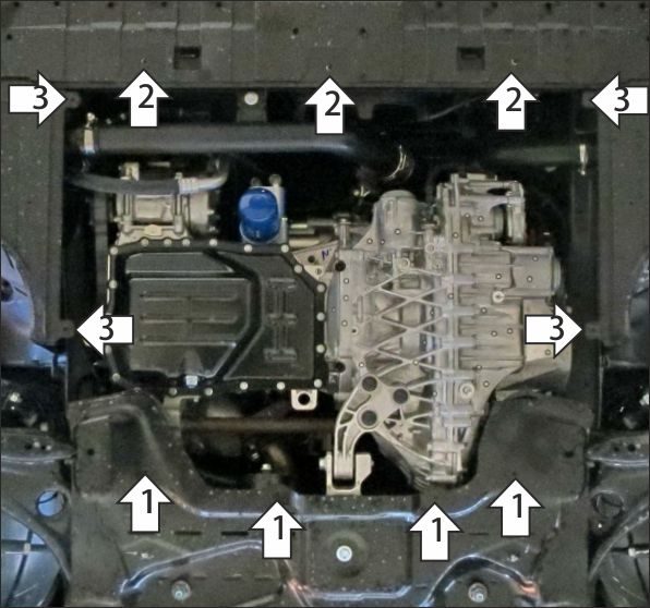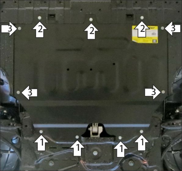 Снять штатный пластиковый пыльник. 1. В штатные резьбовые отверстия в подрамнике подвески установить задние точки крепления щита при помощи болтов М6х20 с шайбами и гр. шайбами 6. 2. В штатные резьбовые отверстия в рамке радиатора установить передние точки крепления щита при помощи болтов М6х30 с шайбами и гр. шайбами 6. 3. Прикрепить боковые пыльники к защите штатным крепежом. Затянуть весь крепеж с требуемым усилием.