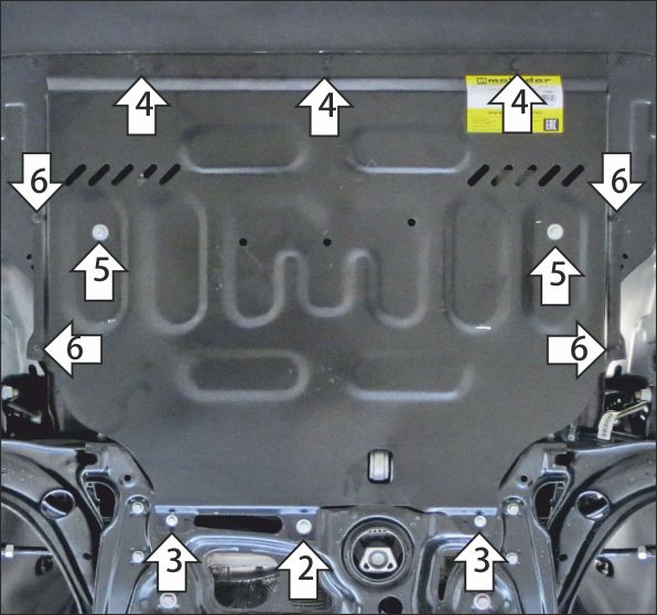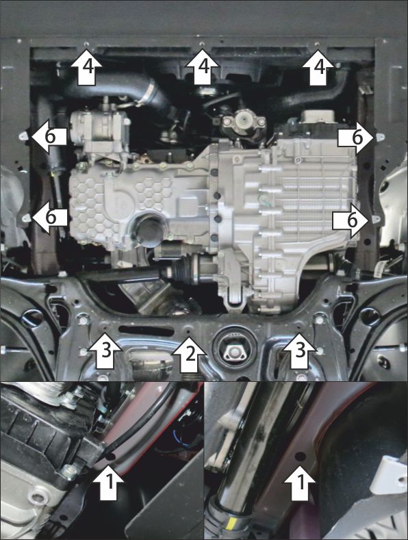 1. Снять штатный пластиковый пыльник. В штатные отверстия в лонжеронах автомобиля установить кронштейны при помощи закладных планок ПУ60х14х6 М8 и болтов М8х30 с шайбами и гр. шайбами 8. 2. В штатное отверстие в подрамнике подвески установить центральную заднюю точку крепления щита при помощи закладной планки и болта М8х30 с шайбой и гр. шайбой 8. 3. В штатные резьбовые отверстия в подрамнике подвески установить боковые задние точки крепления щита при помощи болтов М6х30 с шайбами и гр. шайбами 6. 4. В штатные резьбовые отверстия прикрепить переднюю часть щита при помощи штатного крепежа. 5. Прикрепить щит к кронштейнам при помощи болтов М8х20 с шайбами и гр. шайбами 8. 6. Прикрепить боковые пыльники к щиту штатным крепежом. Затянуть весь крепеж с требуемым усилием.