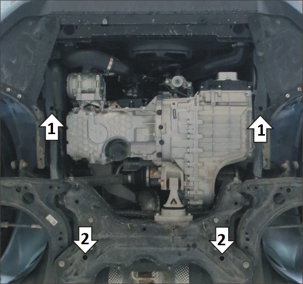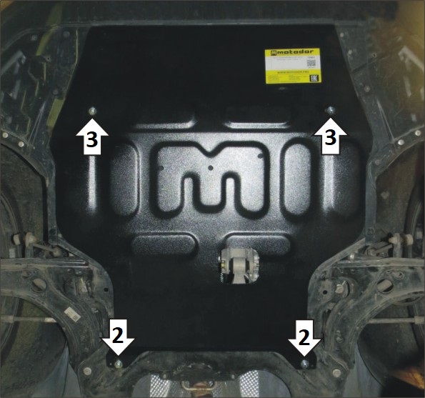 1. Снять штатный пластиковый пыльник. В штатные отверстия в лонжеронах автомобиля установить кронштейны при помощи закладных планок ПУ60х14х6 М8 и болтов М8х30 с шайбами и гр. шайбами 8. Вернуть на место пыльник, сделав в нём отверстия под кронштейны. 2. В штатные отверстия в подрамнике подвески установитьзадние точки крепления щита при помощи закладных планок ПУ60х14х6 М8 и болтов М8х30 с шайбами и гр. шайбами 8. 3. Прикрепить щит к кронштейнам при помощи болтов М8х30 с шайбами и гр. шайбами 8. Затянуть весь крепеж с требуемым усилием.
