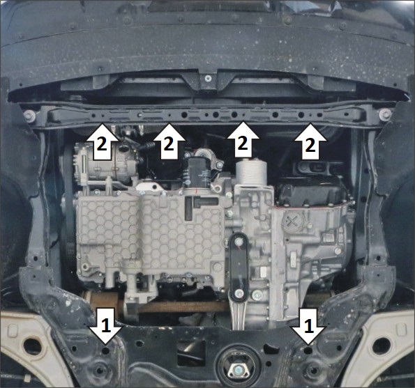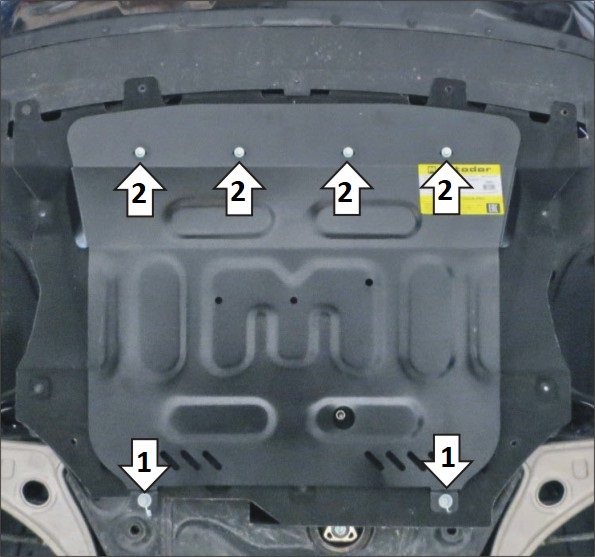 1. Подрезать пыльник и в штатные отверстия в лонжеронах автомобиля установить задние точки крепления защиты при помощи закладных планок ПУ60х14х6 М8 и болтов М8х30 с шайбами и гр. шайбами 8. 2. Просверлить в пыльнике отверстия в районе передних точек крепления защиты и в штатные резьбовые отверстия в поперечине подрамника прикрепить защиту при помощи проставок 20, болтов М6х40 с шайбами и гр. шайбами 6. Затянуть весь крепеж с требуемым усилием.