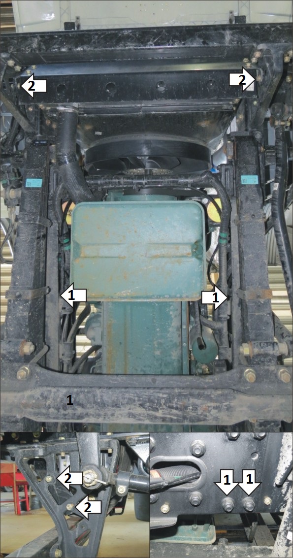 1. Под штатные болты в раме автомобиля установить задние кронштейны (в случае отсутствия передних болтов использовать болты М14х60 с шайбами и гайками М14 из комплекта крепежа). 2. Снять штатную защиту радиатора (при её наличии). В случае необходимости, заменить штатные кронштейны крепления щита на кронштейны из комплекта крепежа, закрепив их либо штатным крепежом, либо болтами М12х40, М12х80, гайками М12 с шайбами12. 3. Прикрепить щит к кронштейнам при помощи болтов М12х40 и гаек М12 с шайбами 12. 4. Прикрепить боковые щитки к кронштейнам при помощи болтов М12х40 с шайбами и гр. шайбами 12. Затянуть весь крепеж.
