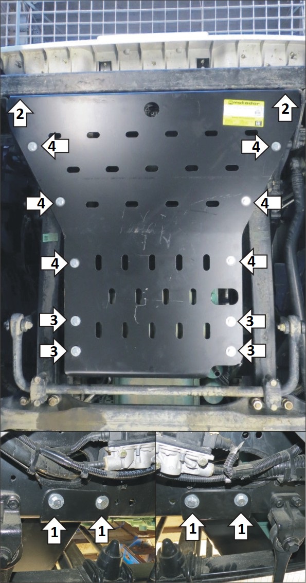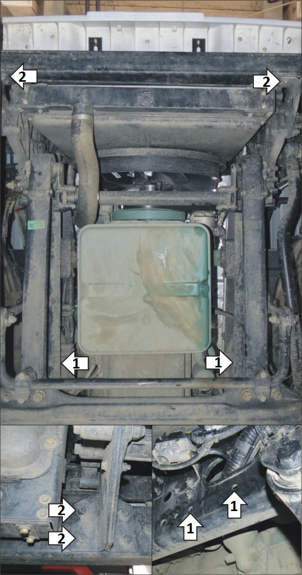 1. В штатные отверстия в раме автомобиля установить задние кронштейны при помощи болтов М12х40 и гаек М12 с шайбами 12. 2. Отвернуть штатные болты крепления бруса и установить передние точки крепления щита при помощи болтов М12х40 (класс прочности 10.9) с шайбами и гр. шайбами 12. 3. Прикрепить щит к кронштейнам при помощи болтов М12х40 и гаек М12 с шайбами 12. 4. Прикрепить боковые щитки к кронштейнам при помощи болтов М12х40 с шайбами и гр. шайбами 12. Затянуть весь крепеж.