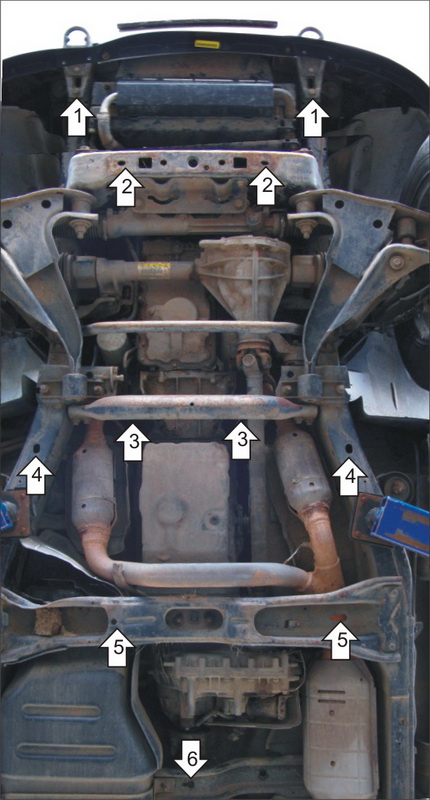 1. Установить передние крепежные точки крепления первого щита под Болты крепления бампера к раме. 2. Установить совместно передние точки второго щита с задними точками первого щита на поперечную балку рамы при помощи ПЗ 101х20х6 М10, Болтов М10х30, Гр10 и Ш10. 3. Установить задние точки второго щита, притянув их Скобами передними к балке, при помощи Болтов М10х30, Гр10 и Ш10. 4. Установить передние точки третьего щита на продольные балки рамы при помощи ПУ 60х14х6, Болтов М8х30, Гр8 и Ш8. 5. Установить задние точки третьего щита совместно с передними точками крепления четвертого щита к поперечной балке при помощи ПЗ 101х20х6 М10, ПР 80х20х6 М10, Скобы задней, Болтов М10х30, Гр10 и Ш10. 6. Установить заднюю точку крепления четвертого щита поперечно балке при помощи ПЗ 101х20х6 М10, Болтов М10х30, Гр10 и Ш10.