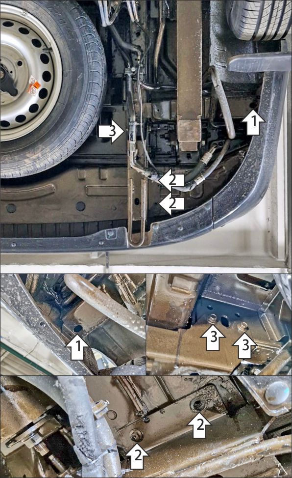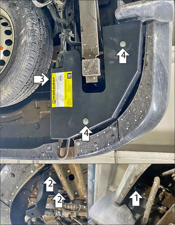 1. В штатное отверстие в кузове автомобиля установить передний кронштейн защиты при помощи закладной планки ПР50х20х6 М8, болта М8х30 с шайбой и гр. шайбой 8. 2. Под штатные болты крепления буксировочной проушины установить задний кронштейн защиты. 3. Под штатные болты крепления буксировочной проушины установить передние точки крепления щита. 4. Прикрепить щит к кронштейнам при помощи болтов М8х30 с шайбами и гр. шайбами 8. Затянуть весь крепеж с требуемым усилием.