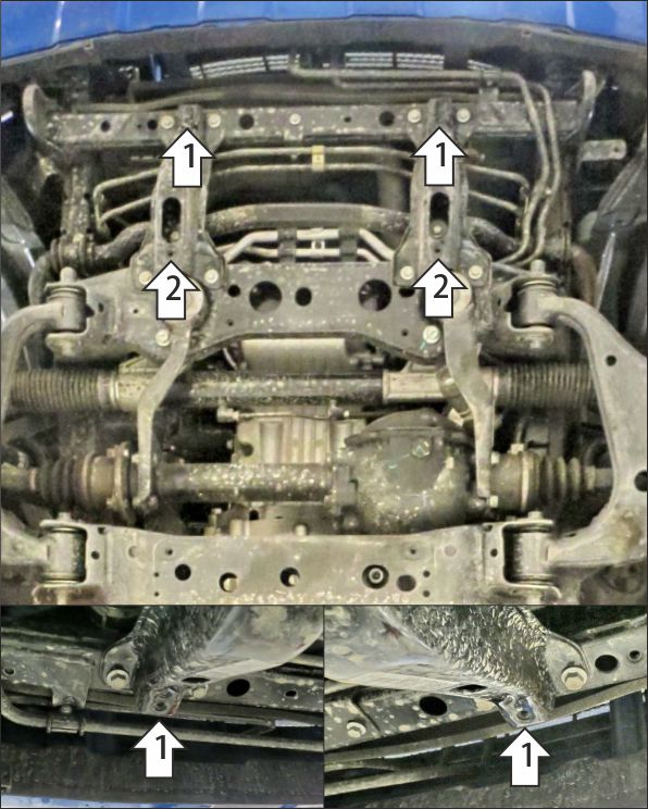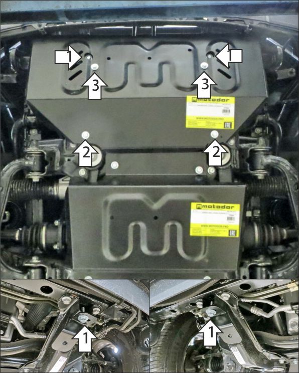 Снять штатный пыльник (при его наличии). 1. В штатные резьбовые отверстия установить кронштейны 02 и 02-01 при помощи болтов М8х20 с шайбам и гр. шайбами 8. 2. В штатные резьбовые отверстия установить задние точки крепления щита при помощи болтов М8х20 с шайбам и гр. шайбами 8. 3.Прикрепить щит к кронштейнам при помощи болтов М8х20 с шайбам и гр. шайбами 8. Затянуть весь крепеж с требуемым усилием.