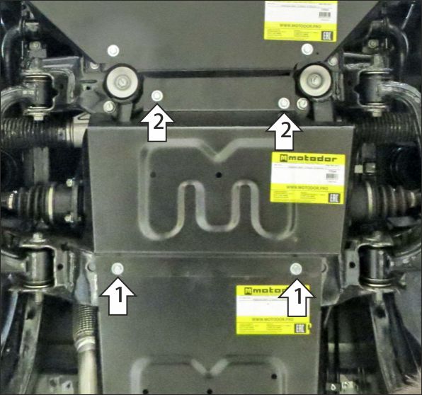 Снять штатный пыльник (при его наличии). 1. В штатные резьбовые отверстия установить задние точки крепления щита при помощи болтов М8х30 с шайбам и гр. шайбами 8. 2. В штатные резьбовые отверстия установить передние точки крепления щита при помощи болтов М8х20 с шайбам и гр. шайбами 8. Затянуть весь крепеж с требуемым усилием.