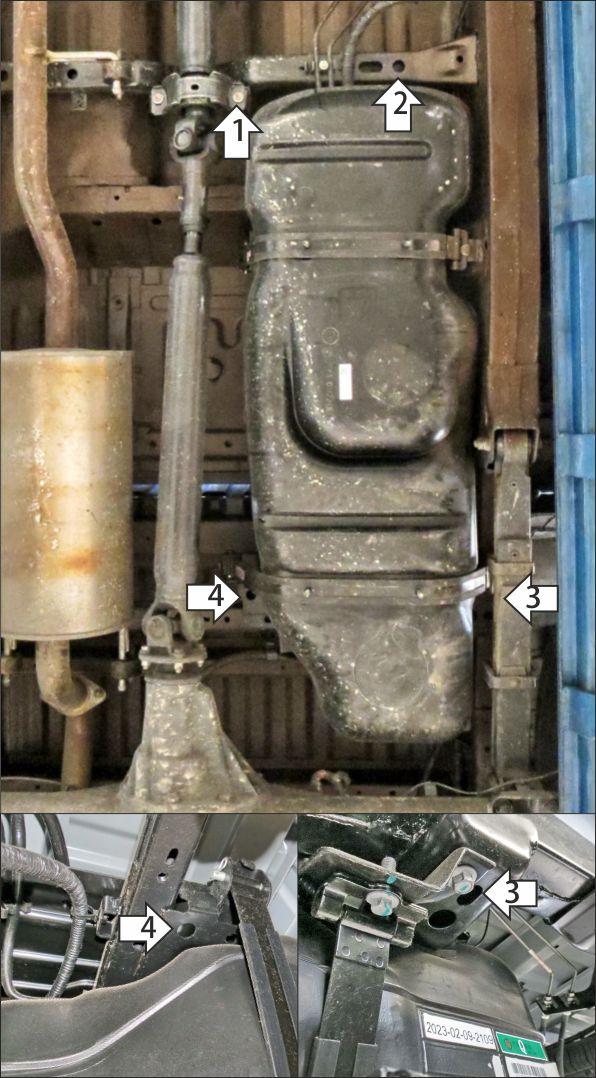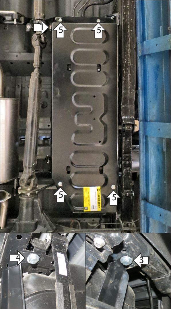 1. Под штатный болт крепления подвесного подшипника карданного вала установить кронштейн 02. 2. В штатное отверстие в поперечине рамы установить кронштейн 03 при помощи закладной планки ПР70х20х6 М10 (планку установить внутрь поперечины) и болта М10х30 с шайбой и гр. шайбой 10. 3. В штатное отверстие в раме установить кронштейн 04 при помощи закладной планки ПР70х20х6 М10 и болта М10х30 с шайбой и гр. шайбой 10. 4. В штатное отверстие в поперечине рамы установить кронштейн 05 при помощи закладной планки ПР70х20х6 М10 и болта М10х30 с шайбой и гр. шайбой 10. 5. Прикрепить щит к кронштейнам при помощи болтов М8х20 с шайбам и гр. шайбами 8. Затянуть весь крепеж с требуемым усилием.
