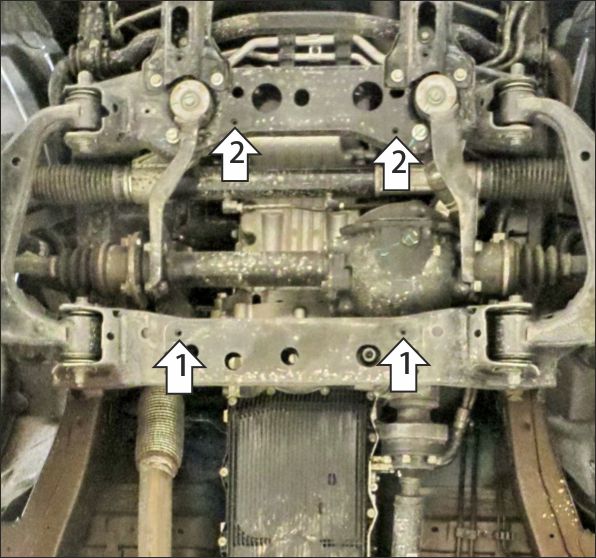 Снять штатный пыльник (при его наличии). 1. В штатные резьбовые отверстия установить задние точки крепления щита при помощи болтов М8х30 с шайбам и гр. шайбами 8. 2. В штатные резьбовые отверстия установить передние точки крепления щита при помощи болтов М8х20 с шайбам и гр. шайбами 8. Затянуть весь крепеж с требуемым усилием.