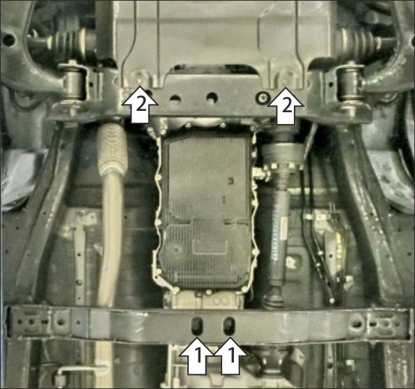 1. В штатные отверстия в поперечине рамы установить задние точки крепления защиты при помощи закладных планок ПР80х20х6 М10 и болтов М10х30 с шайбами и гр. шайбами 10. 2. В штатные резьбовые отверстия в поперечине рамы установить передние точки крепления защиты при помощи болтов М8х30 с шайбами и гр. шайбами 8. Затянуть весь крепеж с требуемым усилием.