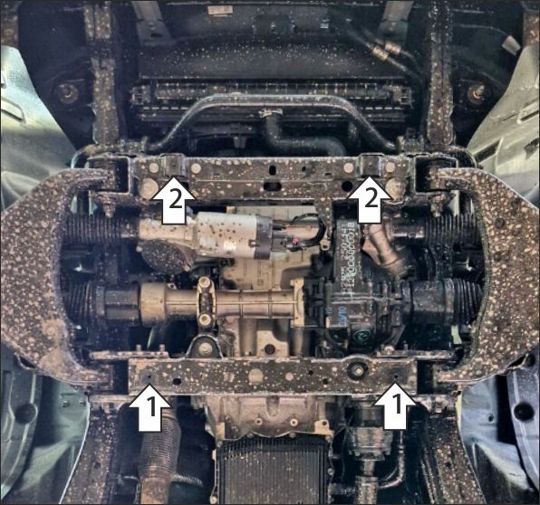 Снять штатную защиту (при её наличии). 1. В штатные резьбовые отверстия установить задние точки крепления щита при помощи болтов М8х30 с шайбам и гр. шайбами 8. 2. В штатные резьбовые отверстия установить передние точки крепления щита при помощи болтов М8х30 с шайбам и гр. шайбами 8. Затянуть весь крепеж с требуемым усилием.