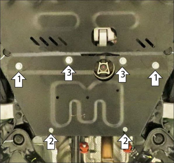Защита устанавливается совместно с защитой двигателя MOTODOR. Защита может устанавливаться как поверх, так и вместо пыльника. 1. Установить передние точки крепления защиты совместно с задними точками крепления защиты двигателя. 2. В штатные резьбовые отверстия в подрамнике установить задние точки крепления защиты при помощи проставок 25 и болтов М6х50 с шайбами и гр. шайбами 6. 3. Прикрепить щит в защите двигателя при помощи болтов М10х20 с шайбами и гр. шайбами 10. Затянуть весь крепеж с требуемым усилием.