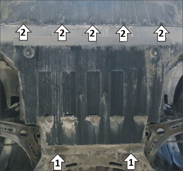 1. В штатные отверстия в подрамнике подвески установить задние крепежные точки защиты при помощи закладных планок ПУ 60х14х6 М8, болтов М8х30 с шайбами и гр. шайбами 8. 2. Выкрутить штатные болты крепления пыльника и в эти же резьбовые отверстия прикрепить передние точки крепления защиты при помощи болтв М6х30 с шайбами и гр. шайбами 6. Затянуть весь крепеж.