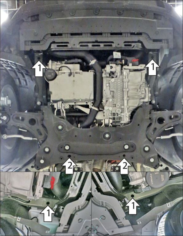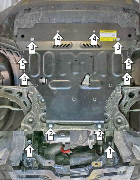 1. Снять штатный пыльник. В штатные отверстия в лонжеронах автомобиля установить передние кронштейны защиты картера при помощи закладных планок ПР 70х20х6 М10 и болтов М10х30 с шайбами и гр. шайбами 10. 2. В штатные отверстия в подрамнике установить задние крепежные точки защиты при помощи закладных планок ПР 70х20х6 М10 и болтов М10х30 с шайбами и гр. шайбами 10. 3. Прикрепить щит к передним кронштейнам при помощи болтов М10х20 с шайбами и гр. шайбами 10. 4. Прикрепить щит к рамке радиатора при помощи болтов М6х20 с шайбами и гр. шайбами 6. 5. Прикрепить локера к щиту защиты картера штатным крепежом. Затянуть весь крепеж с требуемым усилием.