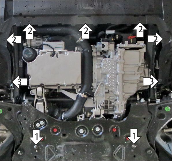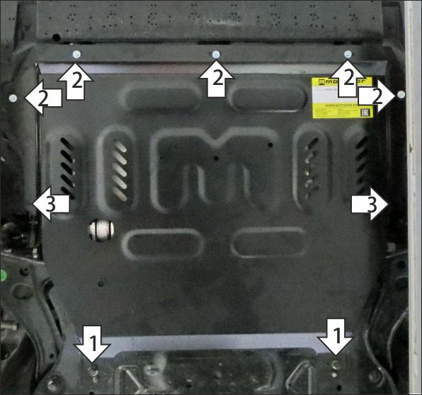 1. Снять штатный пыльник. Под штатные болты в подрамнике автомобиля установить задние точки крепления щита. 2. Прикрепить передние точки крепления щита в штатные резьбовые отверстия при помощи болтов М6х20 с шайбами и гр. шайбами 6 (либо использовать штатный крепеж). 3.Прикрепить локера к щиту штатным крепежом. Затянуть весь крепеж с требуемым усилием.