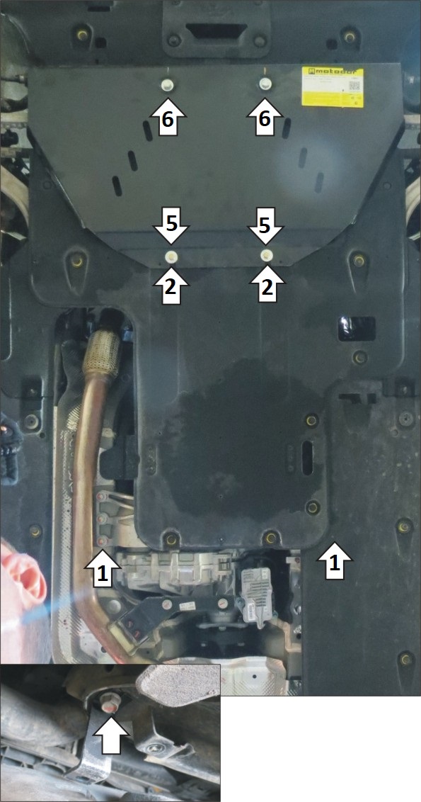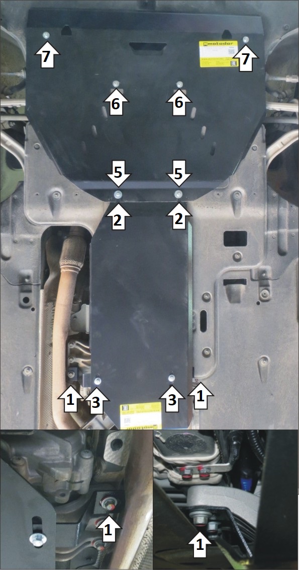 1. Отвернуть болты крепления поперечины коробки передач к кузову, установить под них балку и завернуть болты на место. 2. В отверстия в подрамнике подвески заложить планки ПУ 60х14х6 М8 и установить на них задний щит при помощи болтов М8х30 с шайбами и гр. шайбами 8. 3. Прикрепить задний щит к балке при помощи болтов М8х20 с шайбами 10 и гр. шайбами 8. 4. Снять штатный пыльник, под штатные болты подрамника прикрепить кронштейны. Вернуть на место пыльник, проделав в нём отверстия для кронштейнов. 5. Совместно с передними точками крепления заднего щита установить задние точки переднего щита. 6. В отверстия в подрамнике спереди заложить закладные планки М8 и прикрепить к ним передний щит при помощи проставок 10, болтов М8х40 с шайбами и гр. шайбами 8, предварительно сделва вырез в пыльнике. 7. Прикрепить щит к кронштейнам при помощи болтов М8х20 с шайбами и гр. шайбами 8. Затянуть весь крепеж.