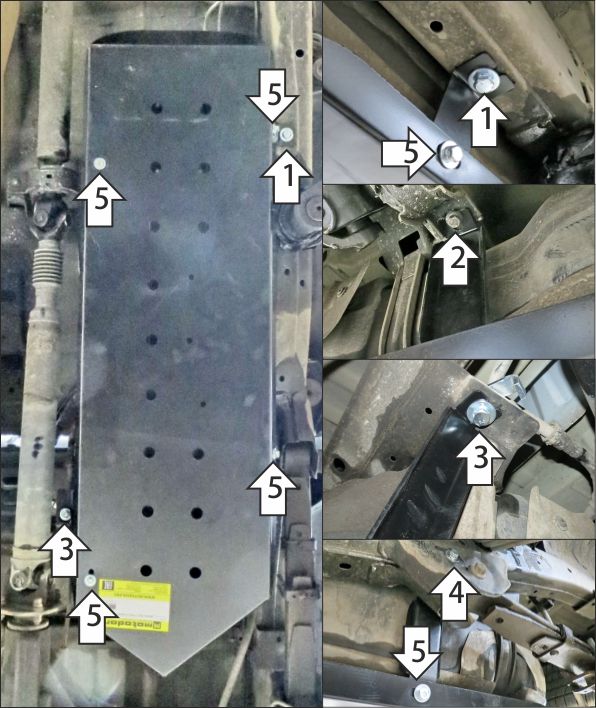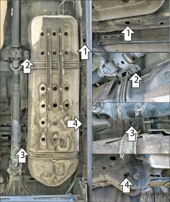 1. Под штатный болт крепления подвесного подшипника карданного вала установить кронштейн 1. 2. В штатное отверстие в поперечине рамы установить кронштейн 2 при помощи закладной планки ПУ60х14х6 М8 (планку установить внутрь поперечины) и болта М8х30 с шайбой и гр. шайбой 8. 3. В штатное отверстие в раме установить кронштейн 3 при помощи закладной планки ПР70х20х6 М10 и болта М10х30 с шайбой и гр. шайбой 10. 4. В штатное отверстие в поперечине рамы установить кронштейн 4 при помощи закладной планки ПР70х20х6 М10 и болта М10х30 с шайбой и гр. шайбой 10. 5. Прикрепить щит к кронштейнам при помощи болтов М8х20 с шайбам и гр. шайбами 8. Затянуть весь крепеж с требуемым усилием.